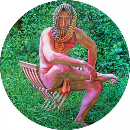 P.P.O.W is pleased to present Robin F. Williams’ second solo exhibition at the gallery entitled “Sons of the Pioneers”. Through a series of paintings Williams challenges the roles of American masculinity and traditional portraiture by replacing the idyllic female, or odalisque, with romanticized scenes of men in various states of idleness. The narratives depicted circle around an inverted version of manifest destiny wherein men abandon their conquests and choose stillness, allowing the next frontier to be an inward quest. Through various painting techniques and a neon palette, Williams drapes each figure with mixed identities that mask traditional signifiers of purpose and patriarchy in order to construct a new and sympathetic masculine mythology.