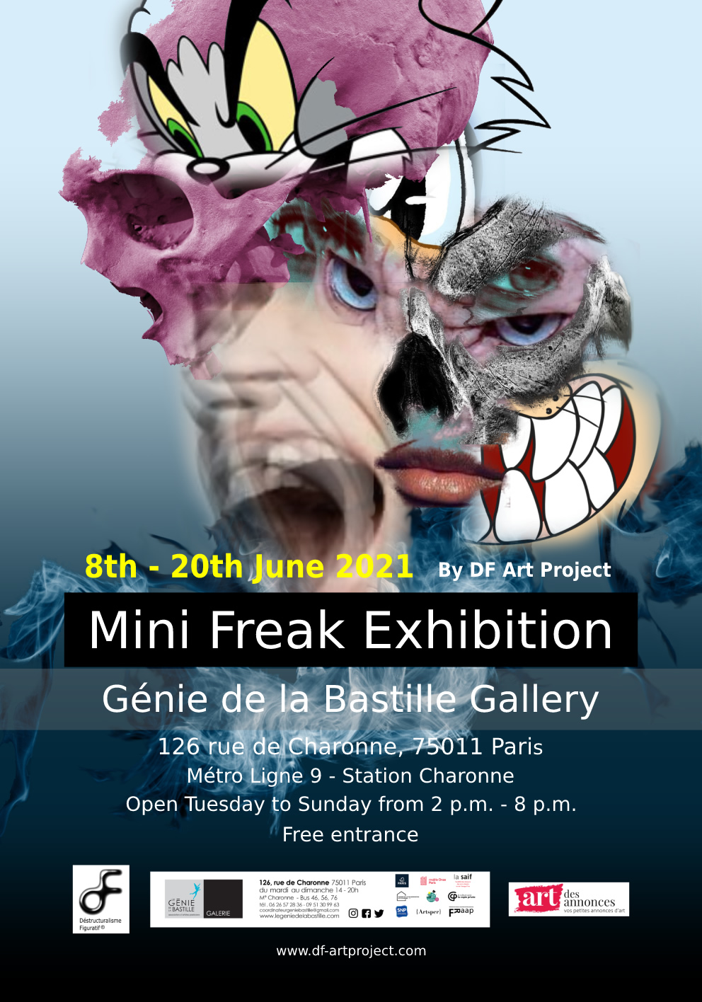 Comisionado por Ronnie Jiang la exposición nos muestra la desfiguración en su esencia, es de agradecer este proyecto que da un aire fresco a una concepción de arte demasiado apartado en los últimos tiempos. DF ART PROJECT ofrece una exposición que reúne a 33 artistas. El colectivo que defiende el Destructuralismo Figurativo reúne en la Galería du Génie de la Bastille en Paris a artistas visuales vivos, testigos de nuestro tiempo, que comparten una visión común de su arte. Consiste en una fragmentación de la figura, su perspectiva y su transformación dinámica. Es una conceptualización de prácticas artísticas ya existentes en pintura, escultura, fotografía, dibujo, collage, arte digital, performance e instalación.